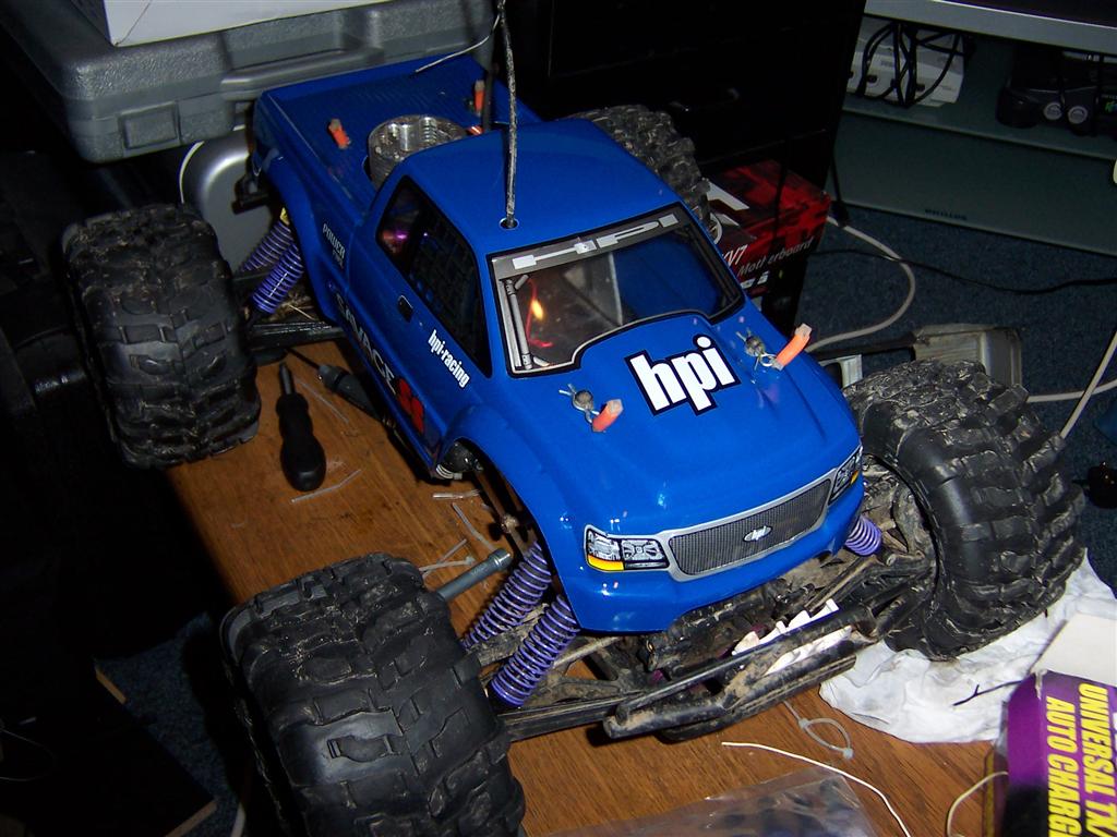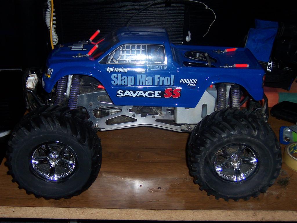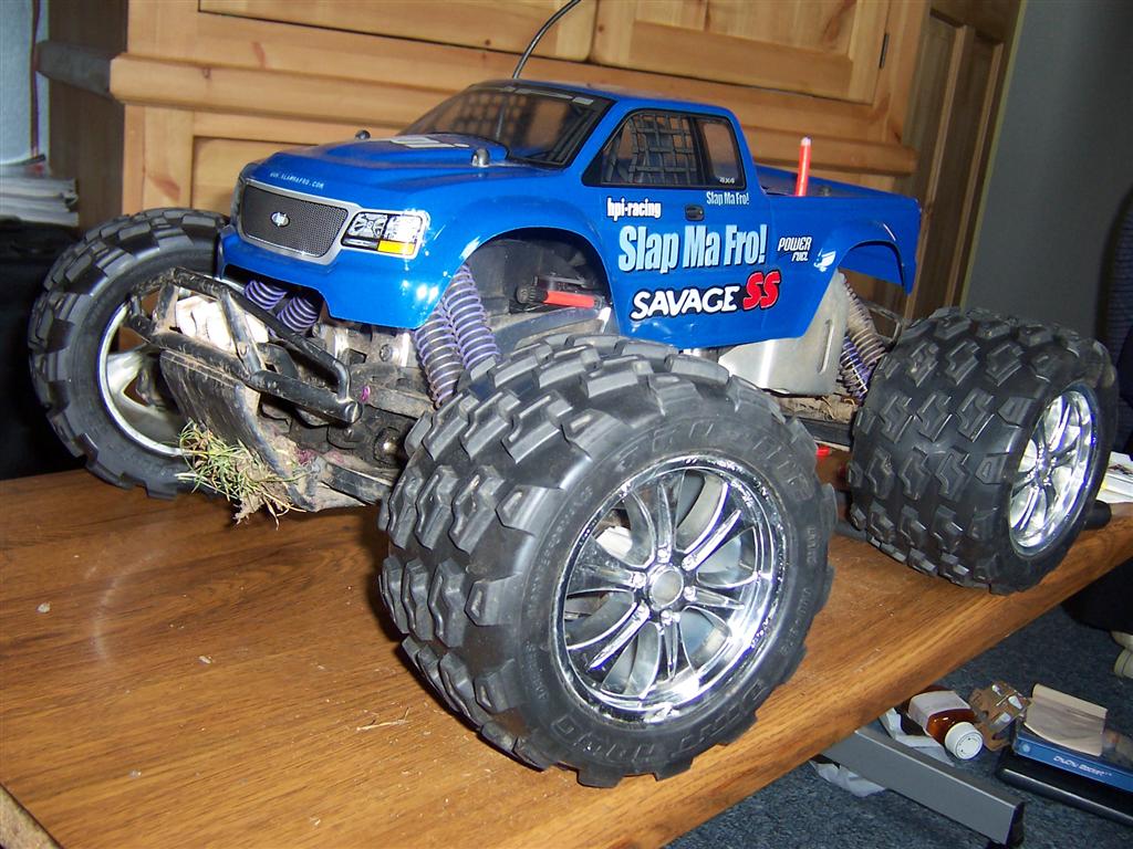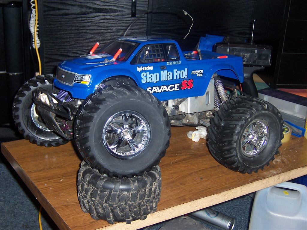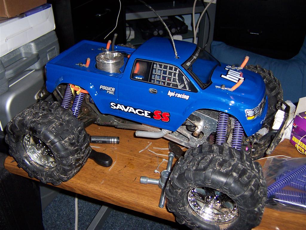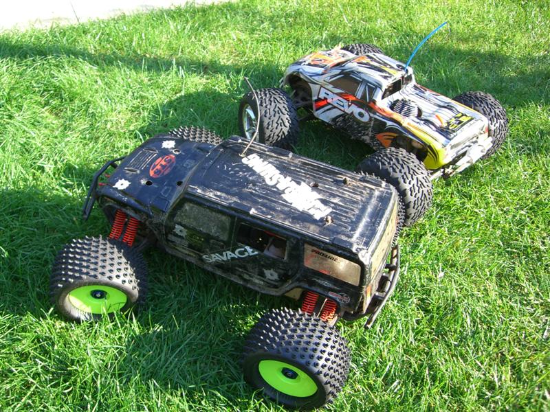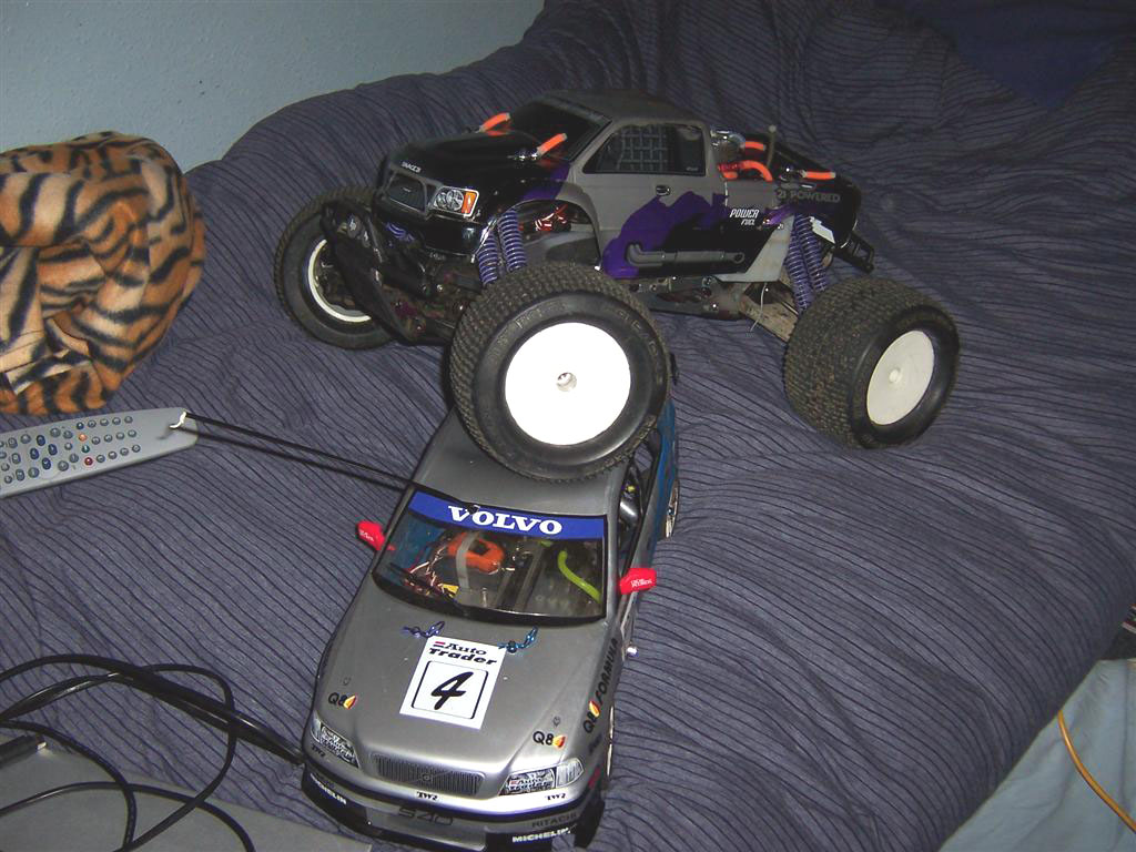 UPDATE - 30th January 2005 And, yes, i've gone and got another RC car :) This time, its a monster truck to sort of 'complete' the set! Its a HPi Savage, running Proline Velocity wide-offset wheels, HPI DirtBonz tyres, my Hyper 21 8 Port engine, and an RB pipe. It has been modded also with Alu shock towers, heavy duty driveshafts, and uprated spider diffs. Here are some pointless little shots of it driving over the road car.