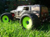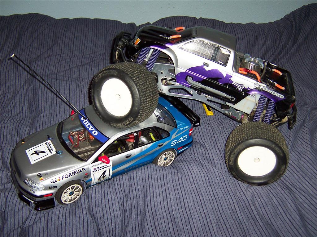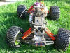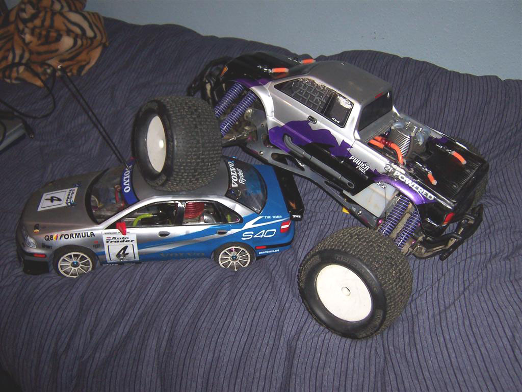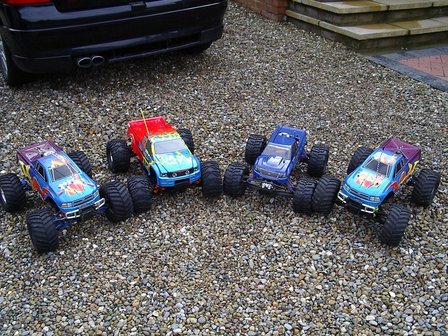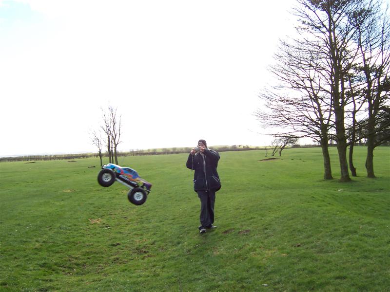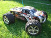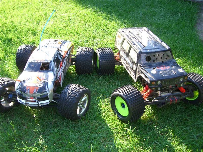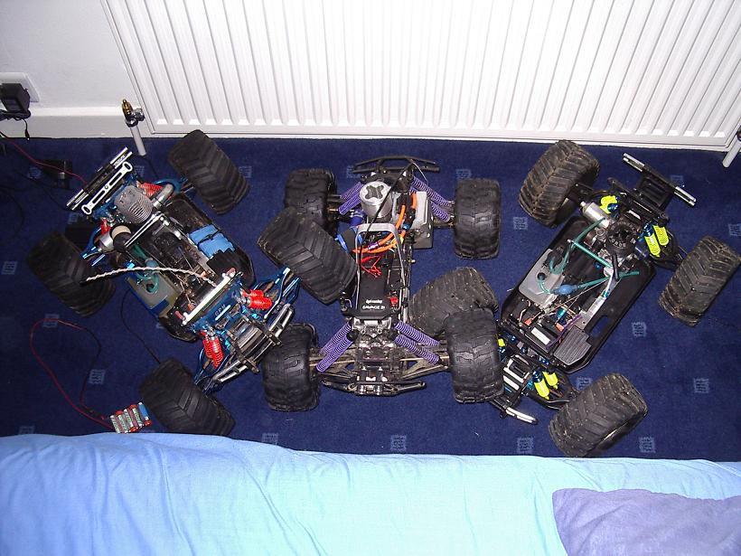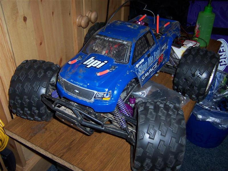 UPDATE - 30th January 2005 And, yes, i've gone and got another RC car :) This time, its a monster truck to sort of 'complete' the set! Its a HPi Savage, running Proline Velocity wide-offset wheels, HPI DirtBonz tyres, my Hyper 21 8 Port engine, and an RB pipe. It has been modded also with Alu shock towers, heavy duty driveshafts, and uprated spider diffs. Here are some pointless little shots of it driving over the road car.