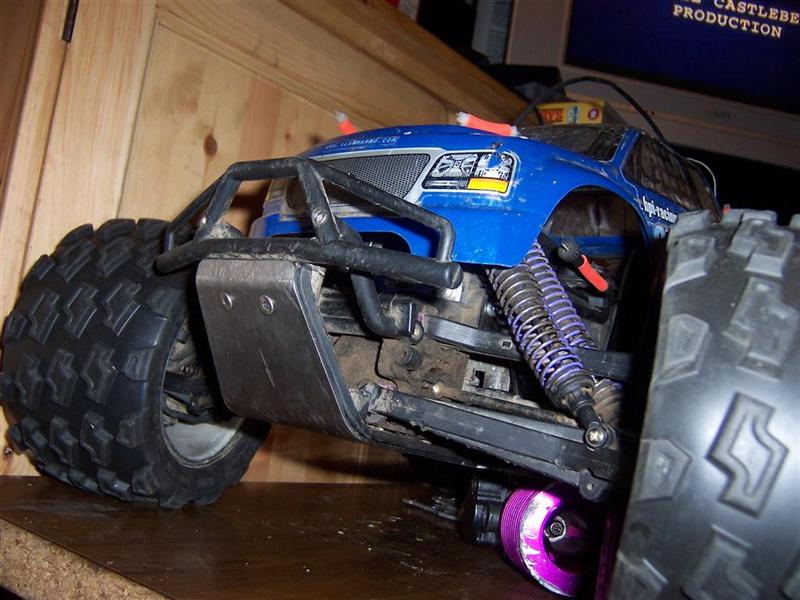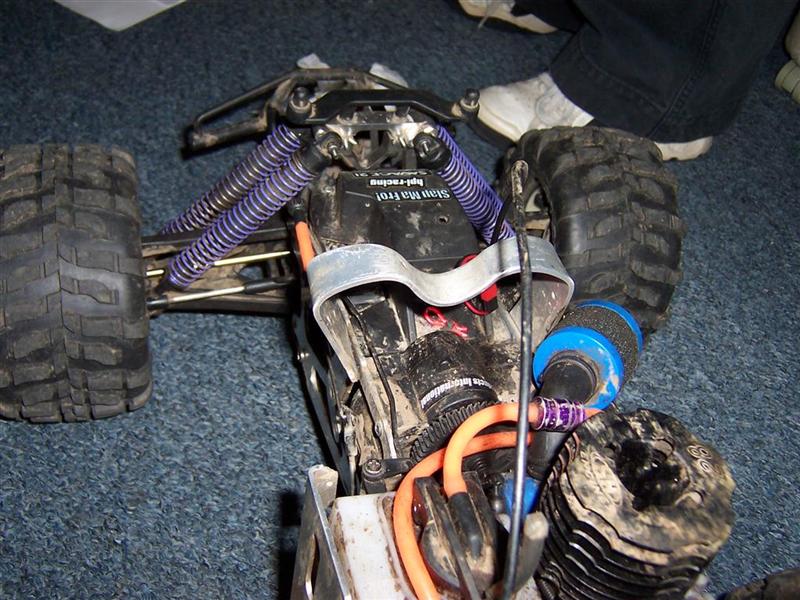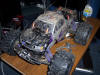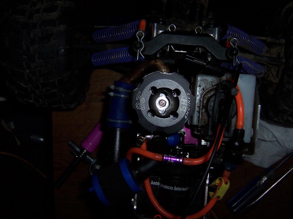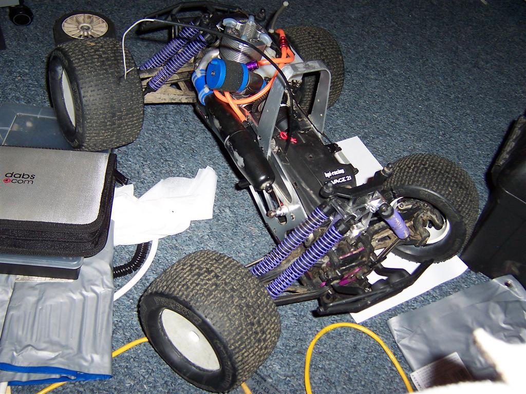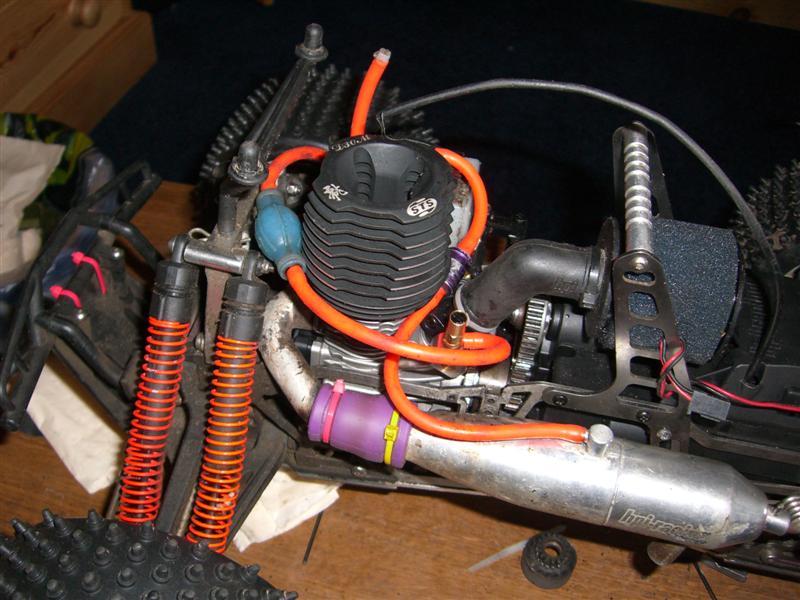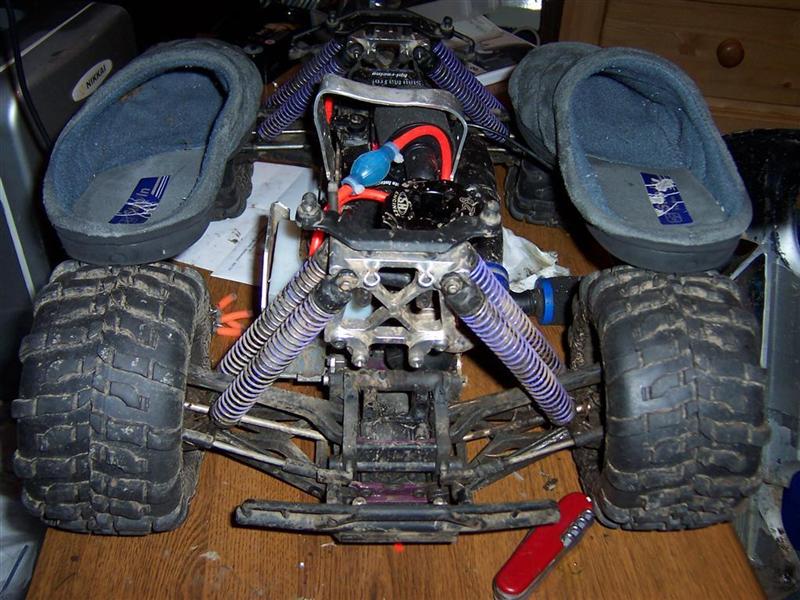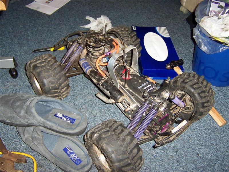 UPDATE - 17th March 2005 Got and fitted a new engine and air filter to the Savage (well, the filter came about 3 weeks later), also, managed to bend the roll bar, then attempt to bend it back, and then collapse the whole rear end :) Behold the awesomeness of my slippers as well ;) As this new engine had a considerable power advantage over the old Hyper (3.6bhp as opposed to 2.5bhp, and much more low down torque) I had to make a few other changes, such as a larger clutchbell, to lessen wheelies, and give more top end speed. Also, its where the other previously done mod's came in useful, such as the heavy duty driveshafts and uprated 4 spider differentials.