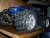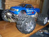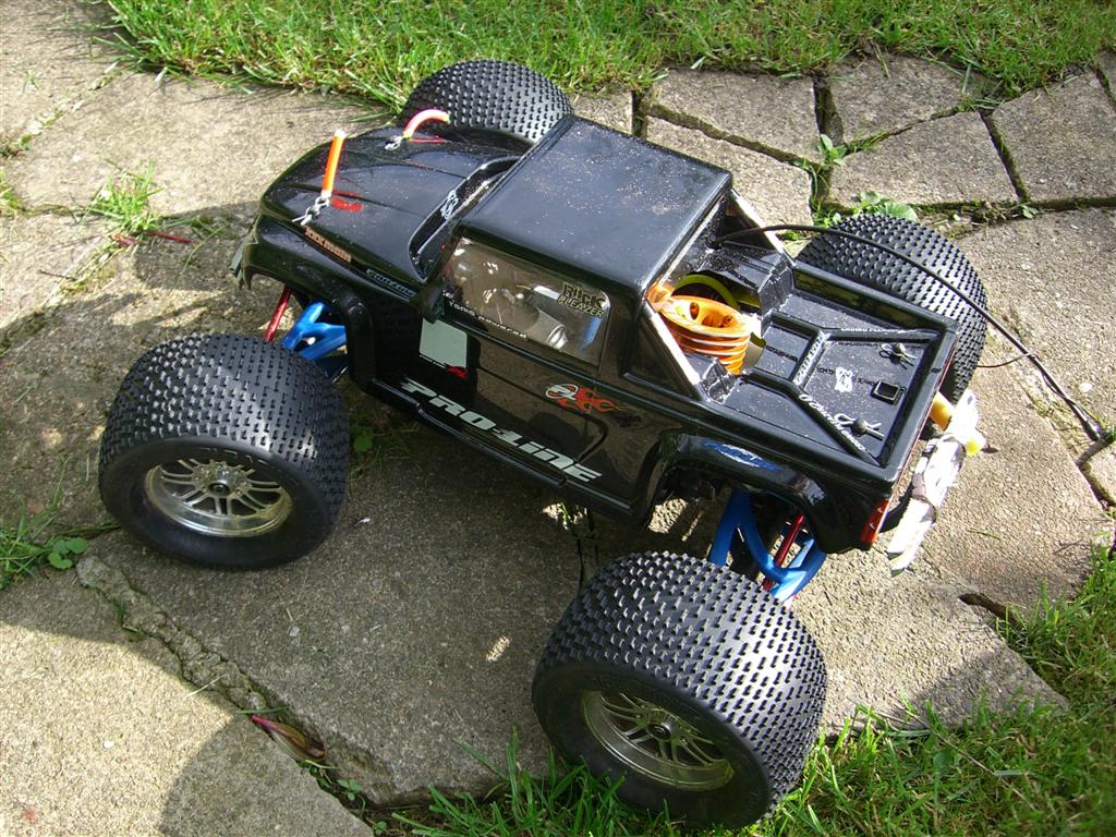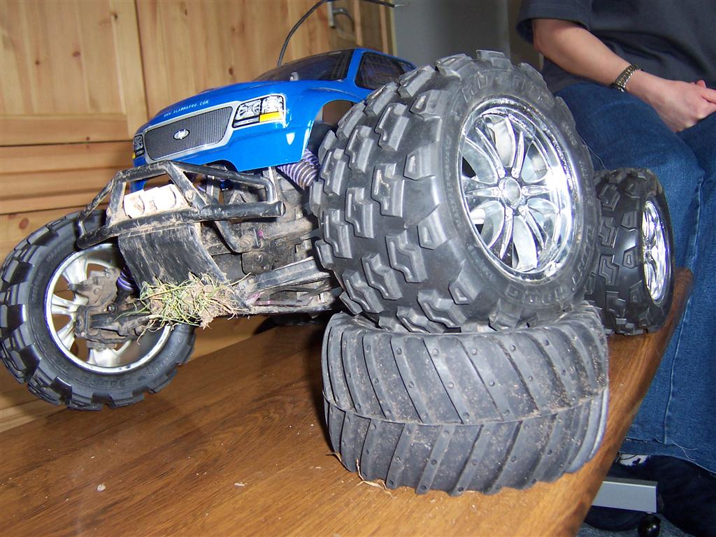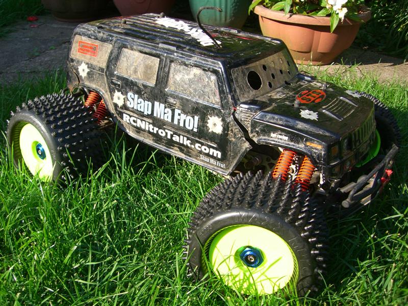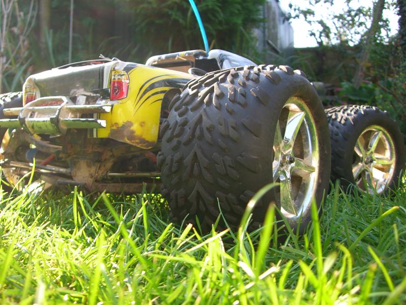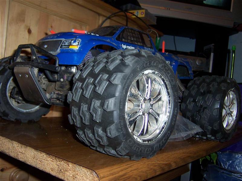 UPDATE - 23rd July 2005 Well I've done quite a few modifications to the truck since the last update. It now sports a HPI K4.6 .28 engine, fitted with roto-start (no more pull starts!), and Hardcore Racing Titanium skids plates on the front and rear, Hardcore Racing Titanium TVP's and roll bar handle! These bits are normally *very* expensive, but I managed to pick them up cheap from Ebay :). These new parts are all shown in the bottom 7 pictures of this update, whereas the top 3 pictures show my newly acquired Hummer H2 shell, which sits quite nicely with the big chrome 40 series wheels. UPDATE - 12th April 2005 More new wheels and tyres! Proline Velocity 6 40 series wheels with Proline Dirt Hawg tyres.