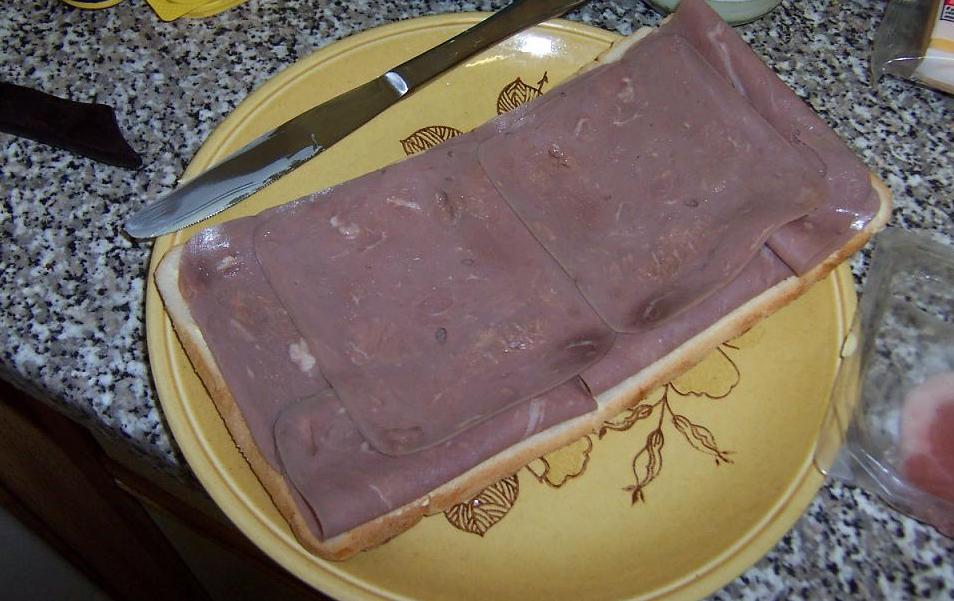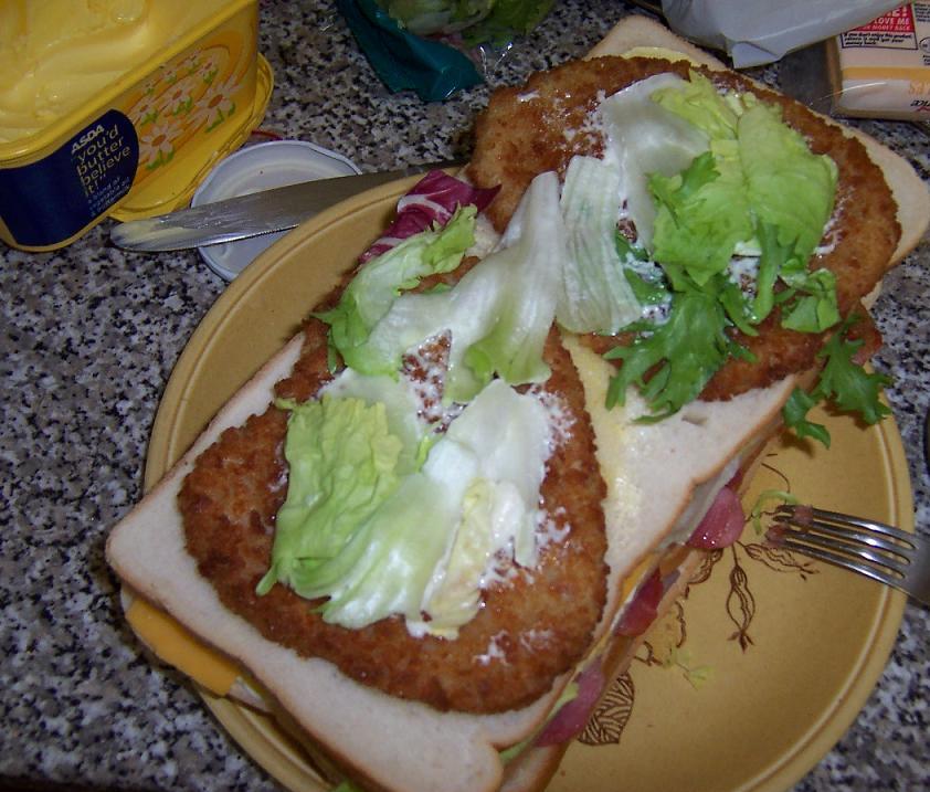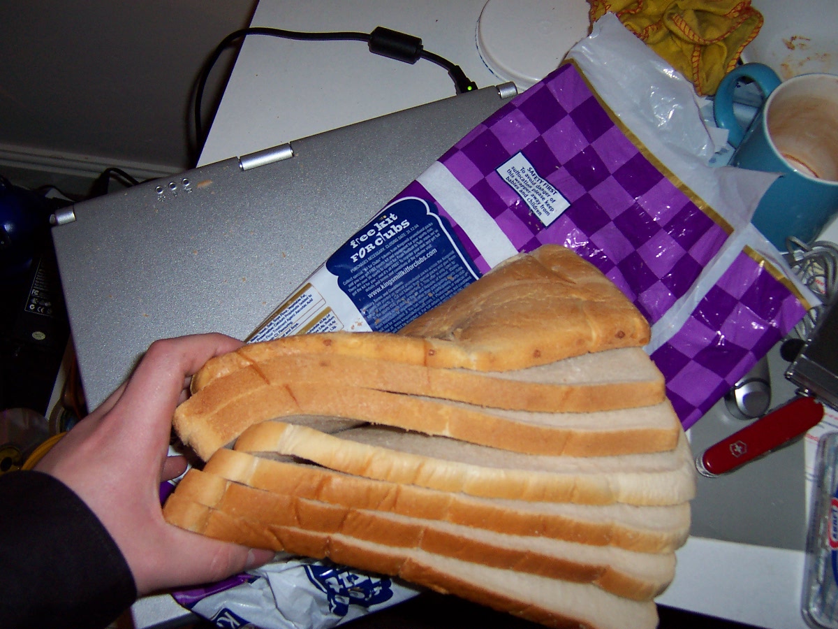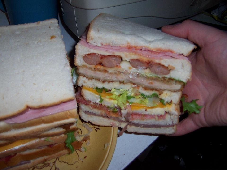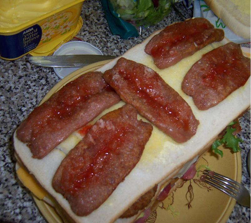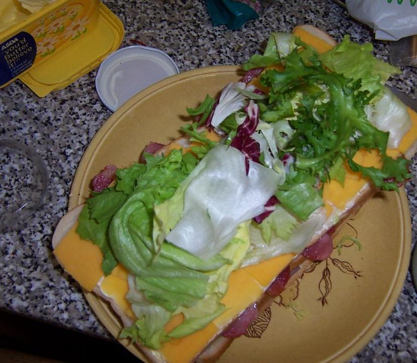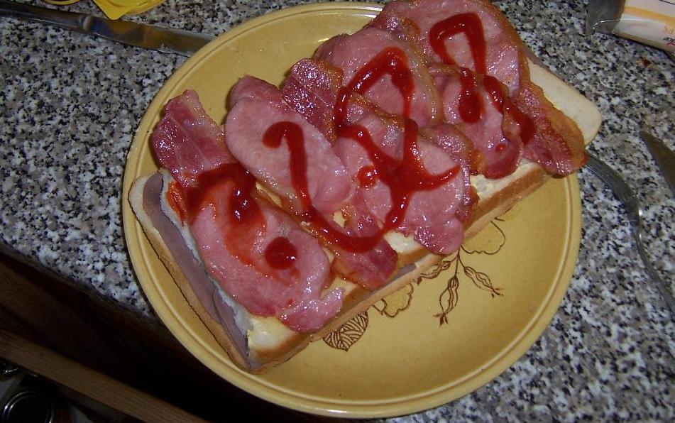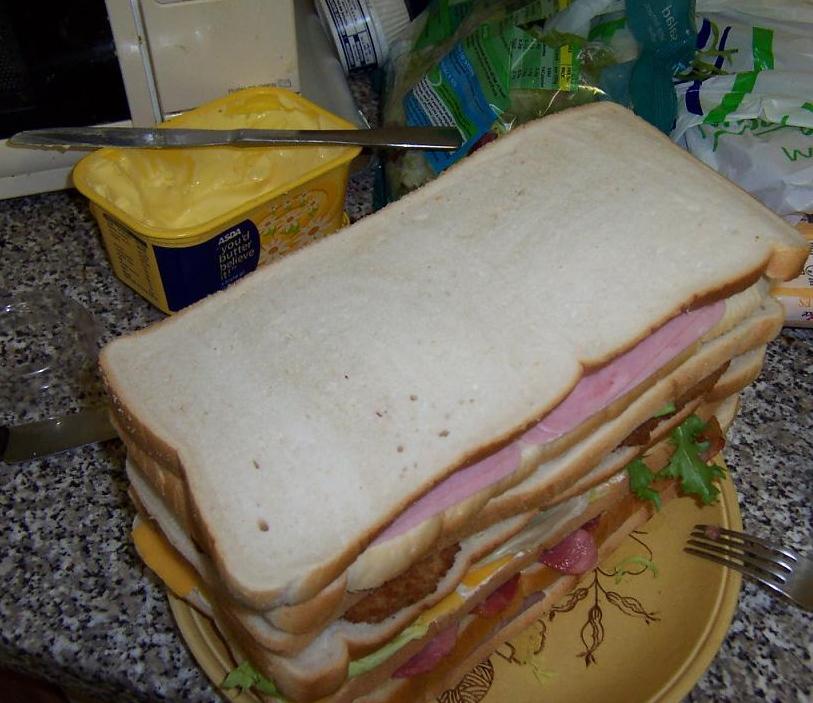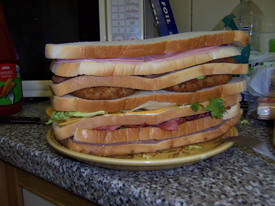 'El Bocadillo Del Diablo' One day, I visited the corner shop local to me, and purchased a loaf of Kingsmill 'Thick Square White' bread. It soon became apparent on opening the packet, that this was no ordinary loaf... It had been sliced lengthways, instead of down. Leaving me with 9, foot long slices of bread. The loaf is now destined for bigger and bolder things. Namely, a foot long, 6 layer sandwich. I have just returned from Asda and have acquired bacon, ham, beef, breaded chicken, tuna, lettace, cheese, mayonnaise and sausages. This will be the greatest sandwich of our time.